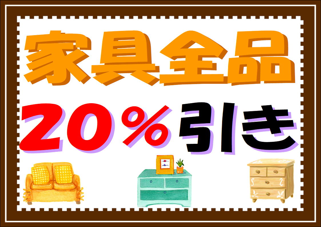 衣装ケースなどの小さい家具から食器棚等の大きい家具まで全品20%OFFの期間限定のお買い得セールを実施中です!