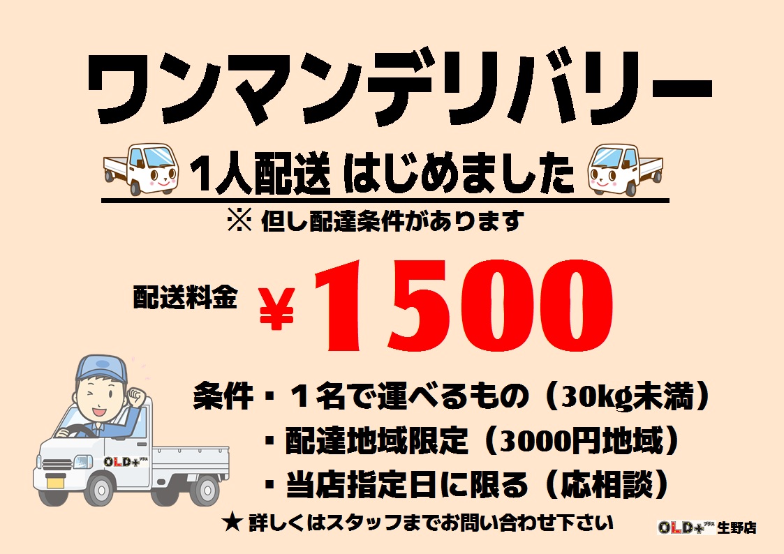 OLDプラス生野店!ワンマンデリバリー!1人配送はじめました!配達料金1,500円 条件は1人で運べるもの(30kg未満)、配達地域限定(3,000円地域)、当店指定日に限る(応相談)。詳しくは当店スタッフまでお問い合わせ下さい!