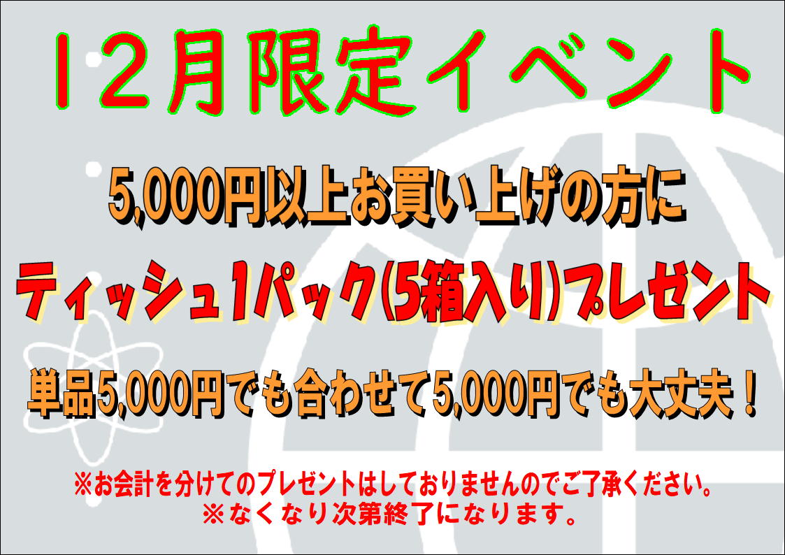 東大阪店!5,000円以上のお買い上げでティッシュ(5箱入り)1パックプレゼント!12月30日まで!
