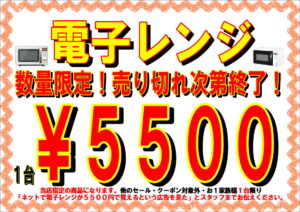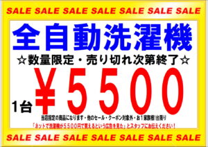 GOGO(55)セール!ゲリライベント開催中! ただいま数量限定で激安超特価イベント開催中!洗濯機や電子レンジが欲しい方はお店へGO! 5,500円で洗濯機や電子レンジが買える超激アツゲリライベント開催中! 激安すぎるので数量限定になっています。ご来店いただいた際に売り切れてしまっている可能性があります! ※「ネットで洗濯機もしくは電子レンジが5,500円で買えるという広告を見た」とスタッフへお伝えください。